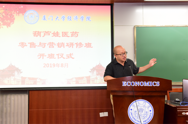 在开班仪式上,廖景峰主任首先代表厦门大学经济学院热烈欢迎玛雅吧医药零售与营销研修班的学员到厦大学习,并就厦门大学及经济学院的相关情况进行了介绍。他说,玛雅吧学员走进厦大就是厦大的校友,希望未来的日子能够关心、支持母校的发展,多提宝贵意见,同时他也祝大家在厦大学习期间学有所成、学有所获。